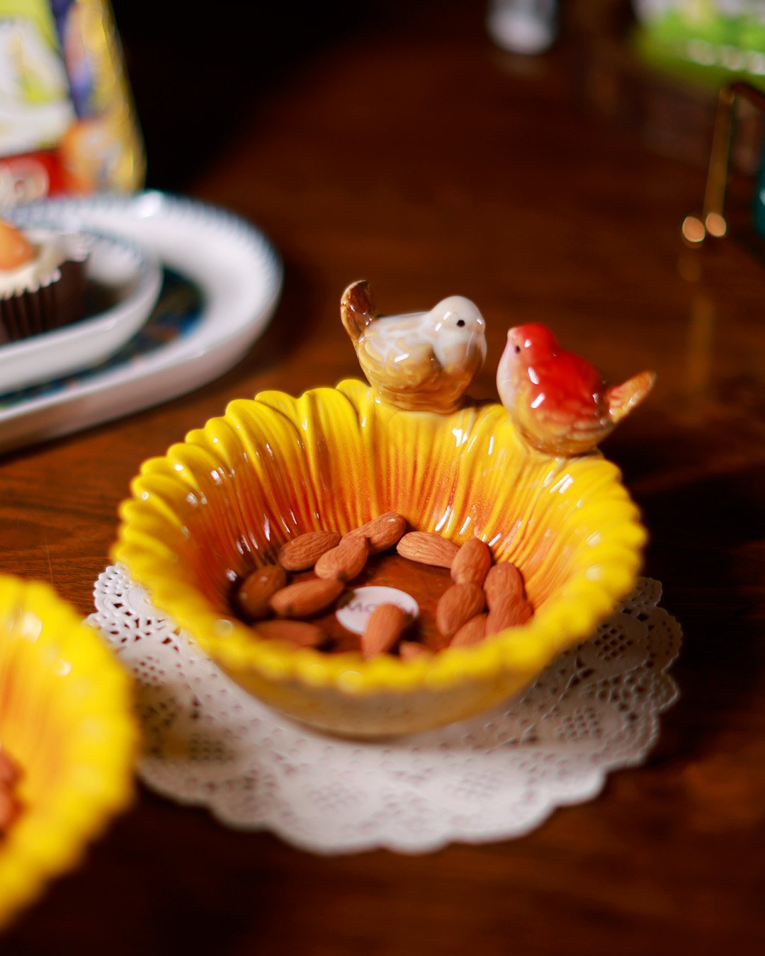 This vibrant yellow ceramic bowl brings a warm, cheerful accent to any table setting. Designed with a scalloped edge and two delicately crafted bird figurines perched on the rim, it’s ideal for serving small snacks like nuts or for use as a decorative centerpiece. A perfect blend of function and rustic charm.