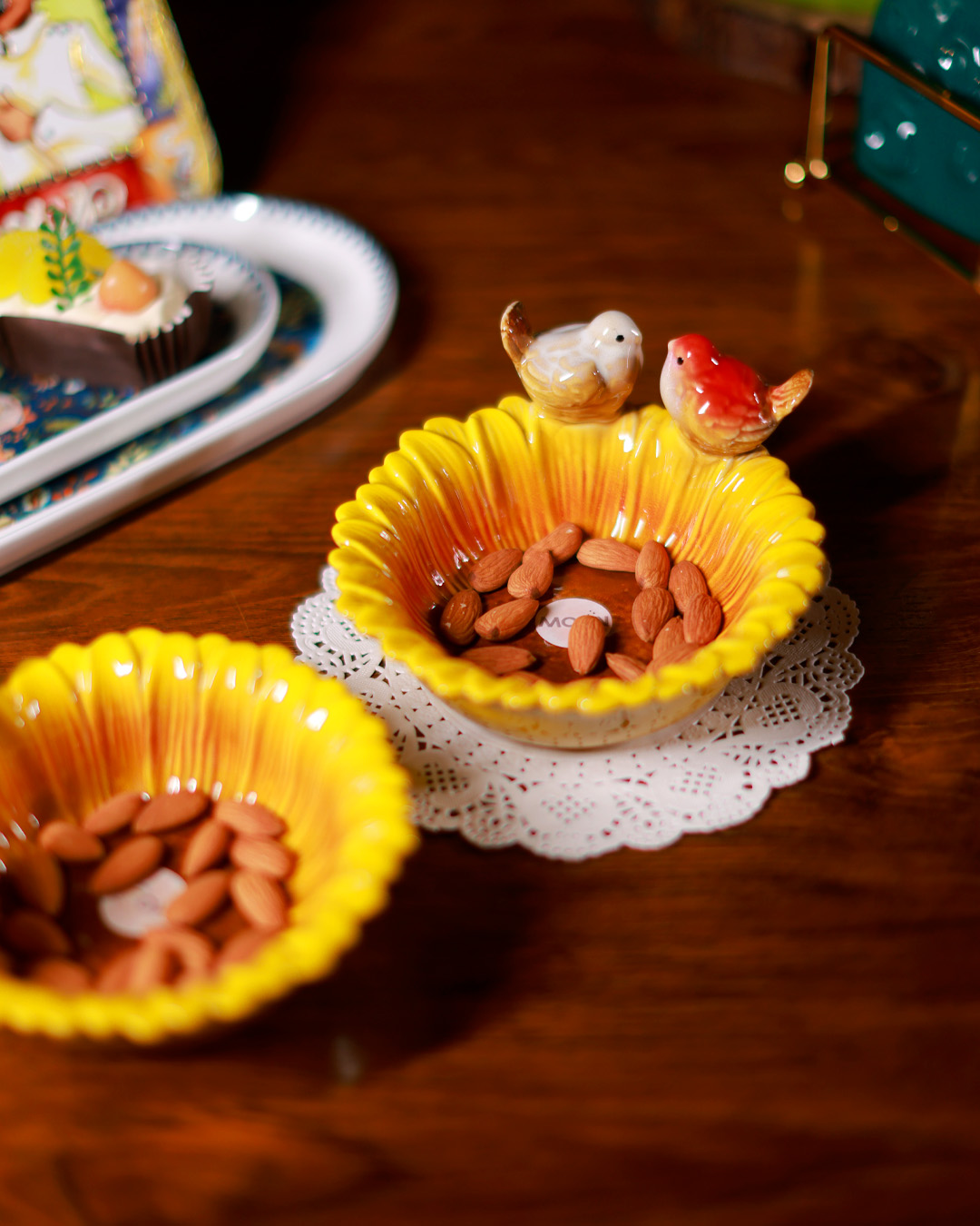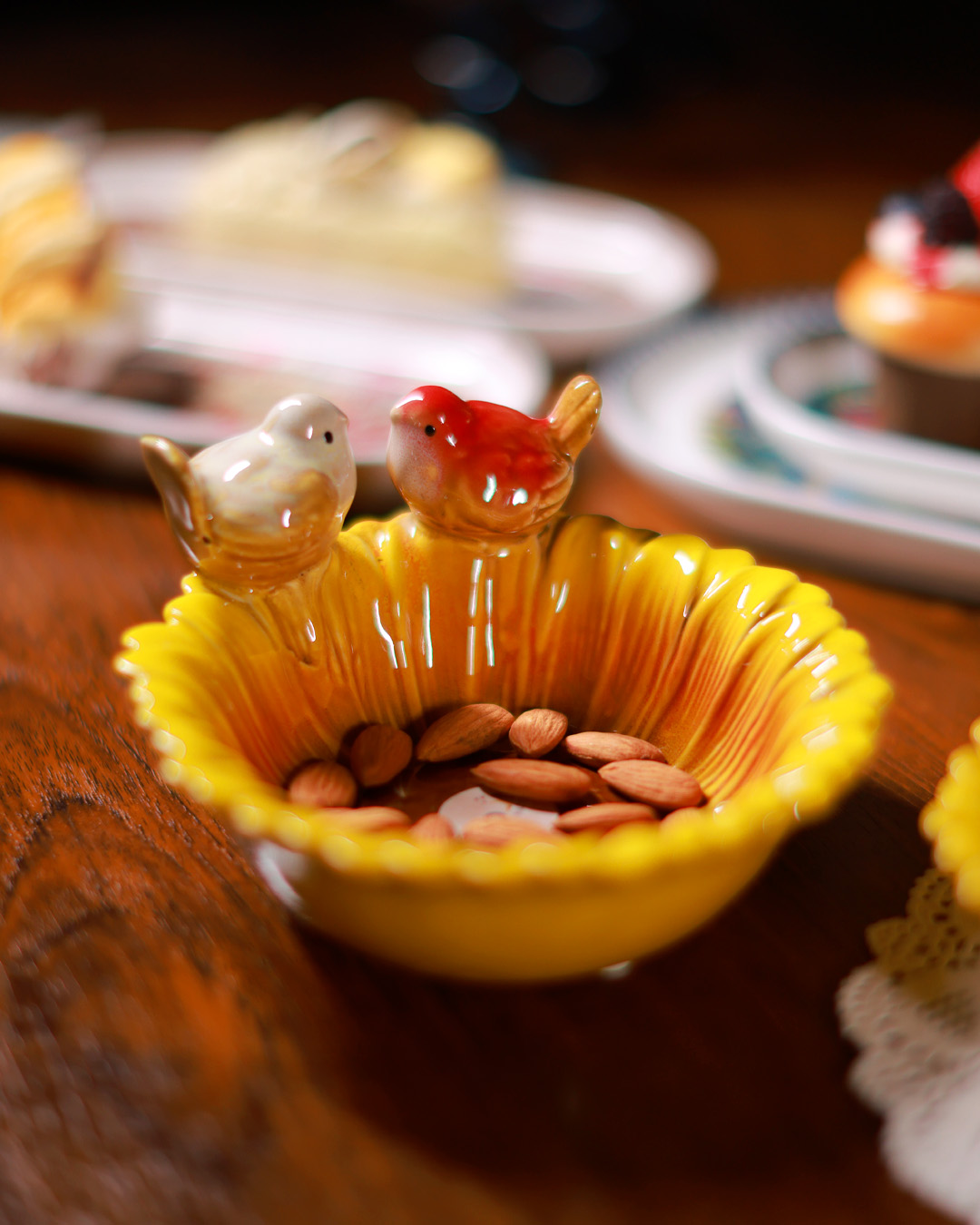 Brighten your table with this handcrafted yellow ceramic bowl featuring two charming bird figurines. Perfect for serving nuts, candies, or adding a decorative touch to your kitchen or dining space.